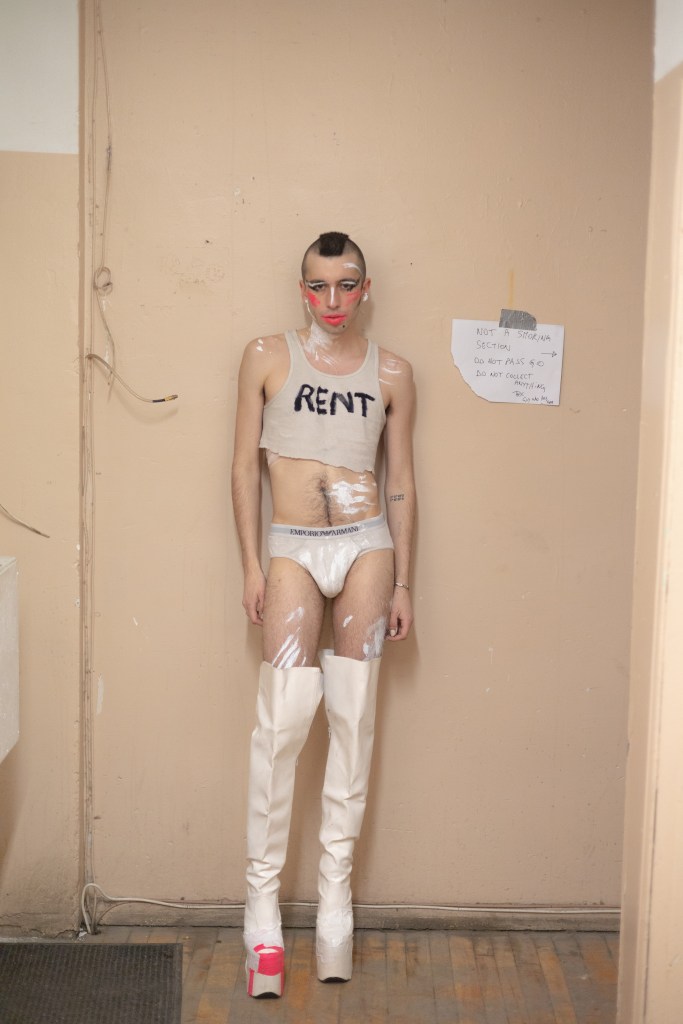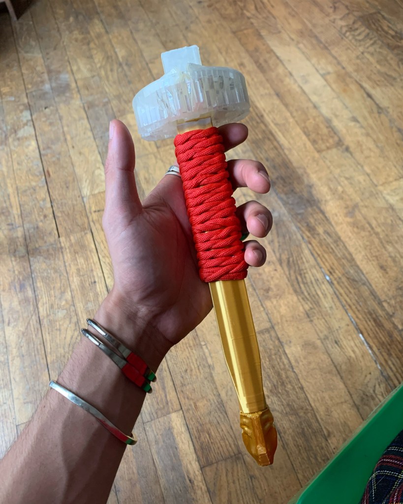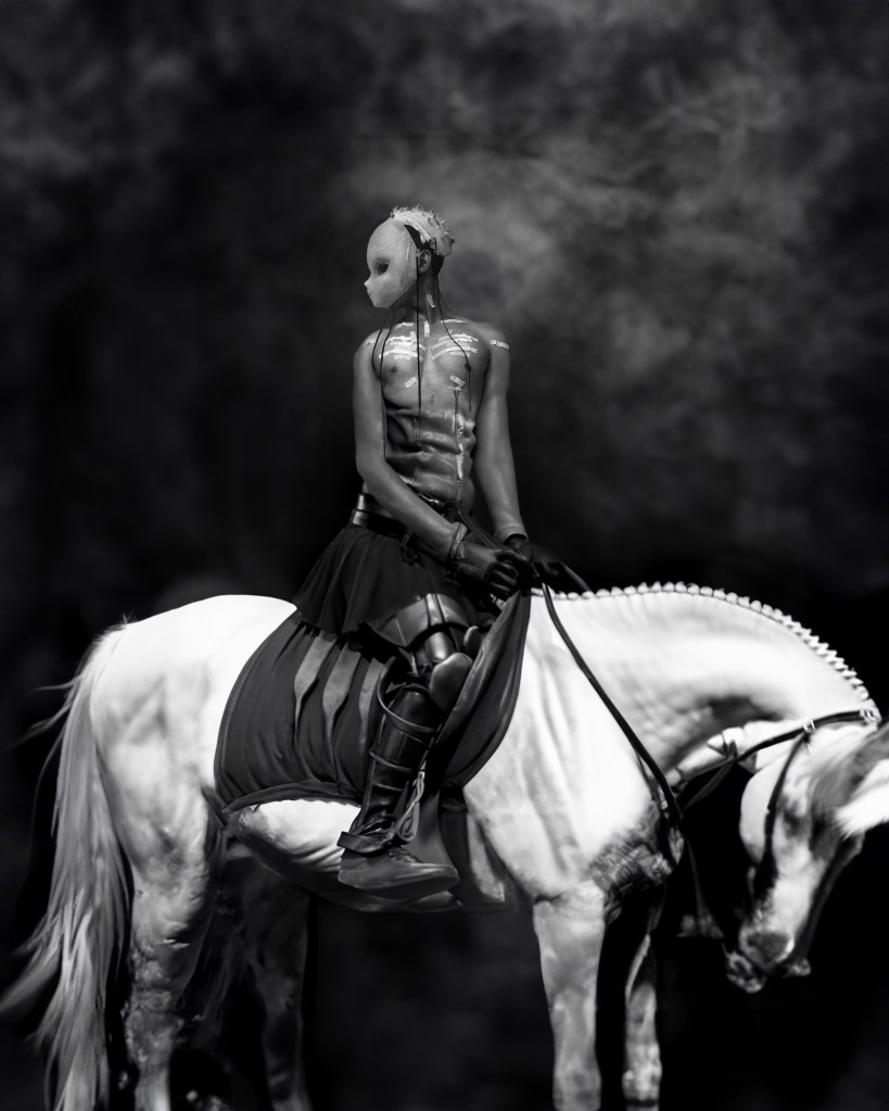 A skinny knight with zippers on their frame